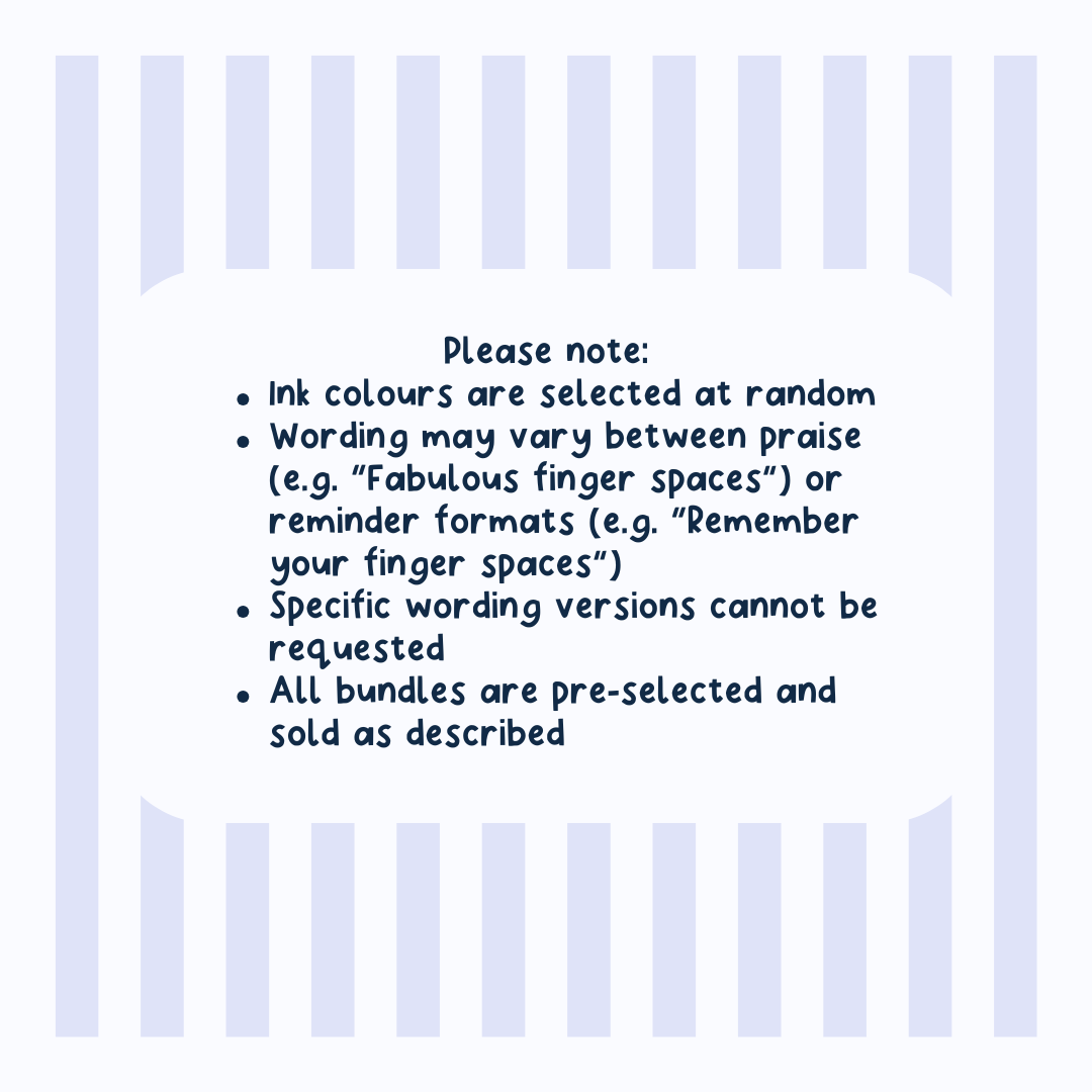Wording may vary between praise (e.g. “Fabulous finger spaces”) or reminder formats (e.g. “Remember your finger spaces”)